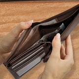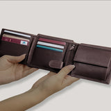 Esta billetera está fabricada con cuero auténtico color café, suave al tacto y con un acabado natural que mejora con el tiempo. Su diseño clásico se complementa con detalles pensados para la vida diaria: doble compartimento para billetes, monedero con cierre, espacio para identificación visible y capacidad para hasta 6 tarjetas.