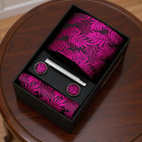 Esta atrevida corbata rosa mide 7,5 cm de ancho y luce un estampado de helechos. Incluye un pañuelo a juego de 23 x 23 cm, gemelos a juego y un pasador de corbata de regalo.