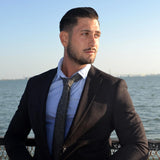 Estas corbatas están hechas a mano con lana auténtica, lo que les da un tacto de textura profunda. Su fino ancho de 6,5 cm le da un aspecto moderno y elegante. Esta corbata gris oscuro tiene un sutil patrón de espiga. La corbata tiene sutiles hilos dorados que recorren aleatoriamente el diseño y brillan a la luz.