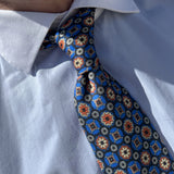 Corbata azul marino estilo italiano confeccionada en seda con estampado geométrico en colores cremas y naranjas con 7,5 cm de ancho.