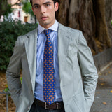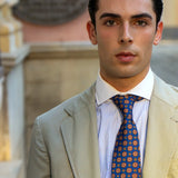 Esta corbata de estilo italiano mide 7,5 cm de ancho y está confeccionada con seda. Presenta un patrón geométrico clásico en rojo y amarillo.