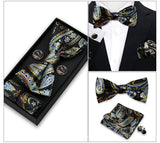 Este conjunto de regalo de 3 piezas incluye una pajarita con estampado paisley (12 x 6 cm), gemelos a juego y un pañuelo de bolsillo de 23 cm. El diseño presenta brillantes tonos dorados, azules y negros. Perfecto para un look impactante.