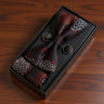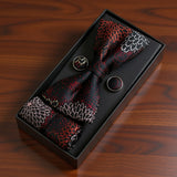 Este set de regalo de 3 piezas incluye una pajarita negra (12 x 6 cm), gemelos a juego y un pañuelo de bolsillo de 23 cm. Cada pieza presenta un estampado floral rojo y blanco que parece plumas.