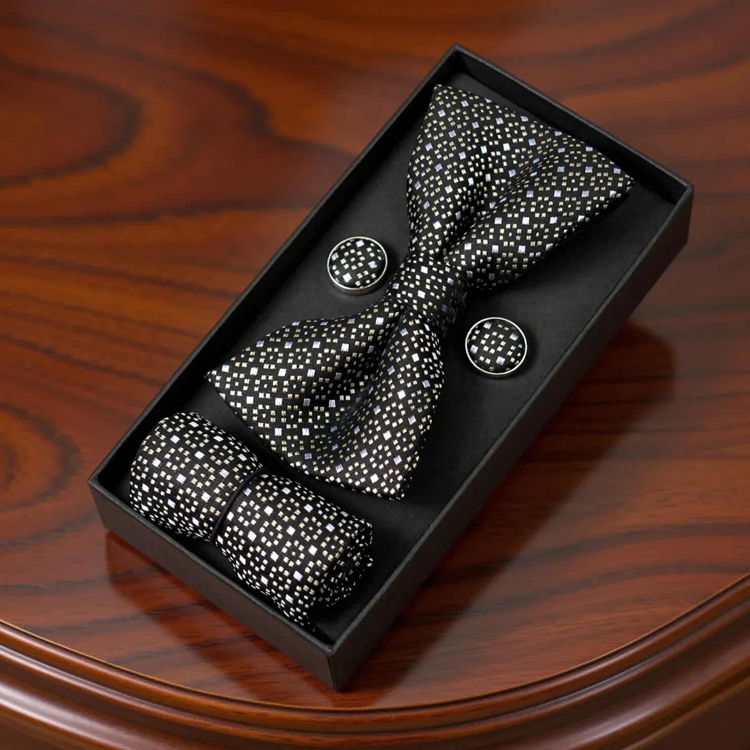 Este set de regalo de 3 piezas incluye una pajarita negra (12 x 6 cm), un par de gemelos y un pañuelo de bolsillo de 23 cm. Cada pieza tiene un patrón geométrico de flores en plata y blanco. Perfecto para combinar con un esmoquin.