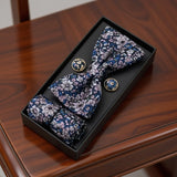 Este set de regalo de 3 piezas incluye una pajarita azul (12 x 6 cm), gemelos a juego y un pañuelo de bolsillo de 23 cm. Cada pieza tiene un sutil estampado floral de color rosa plateado.