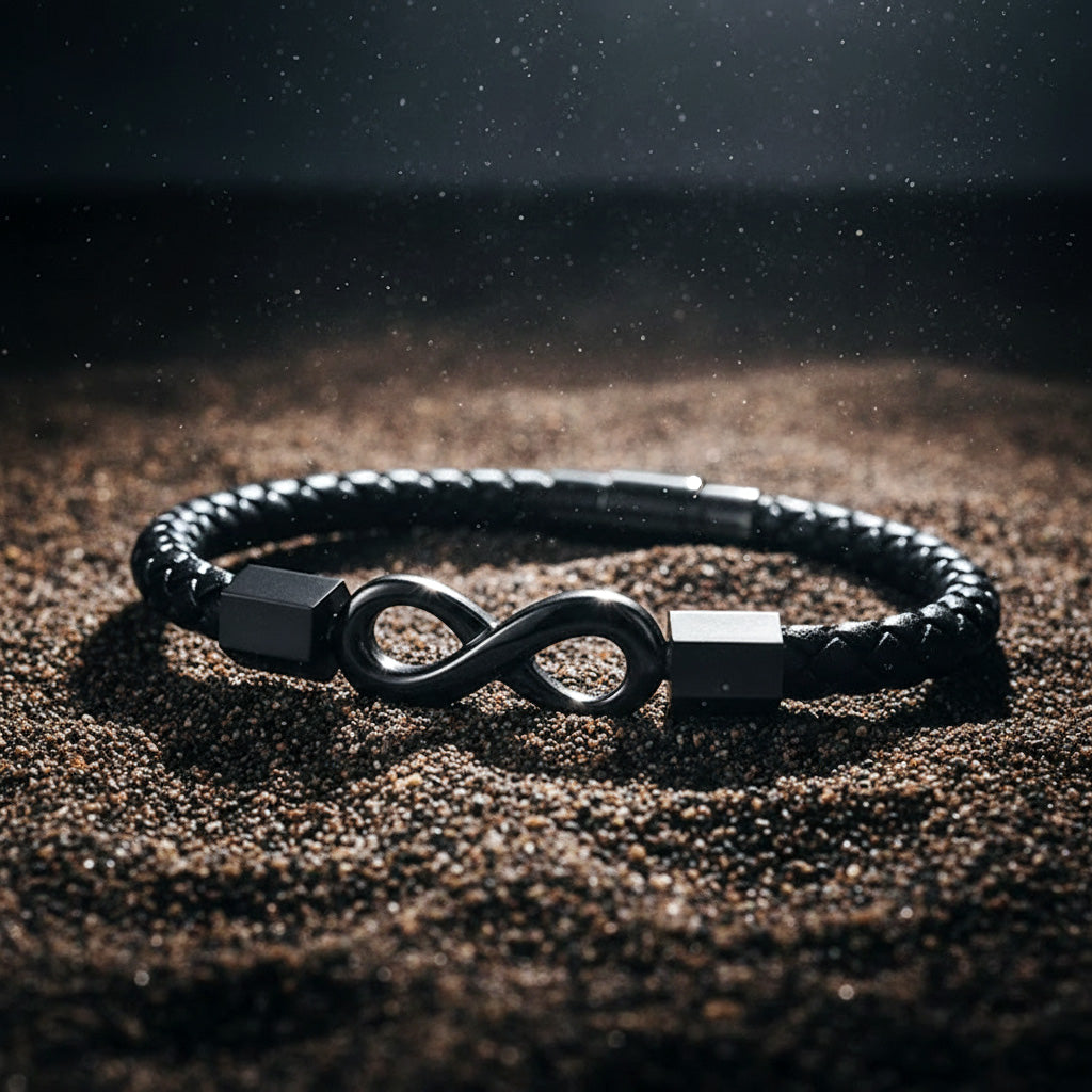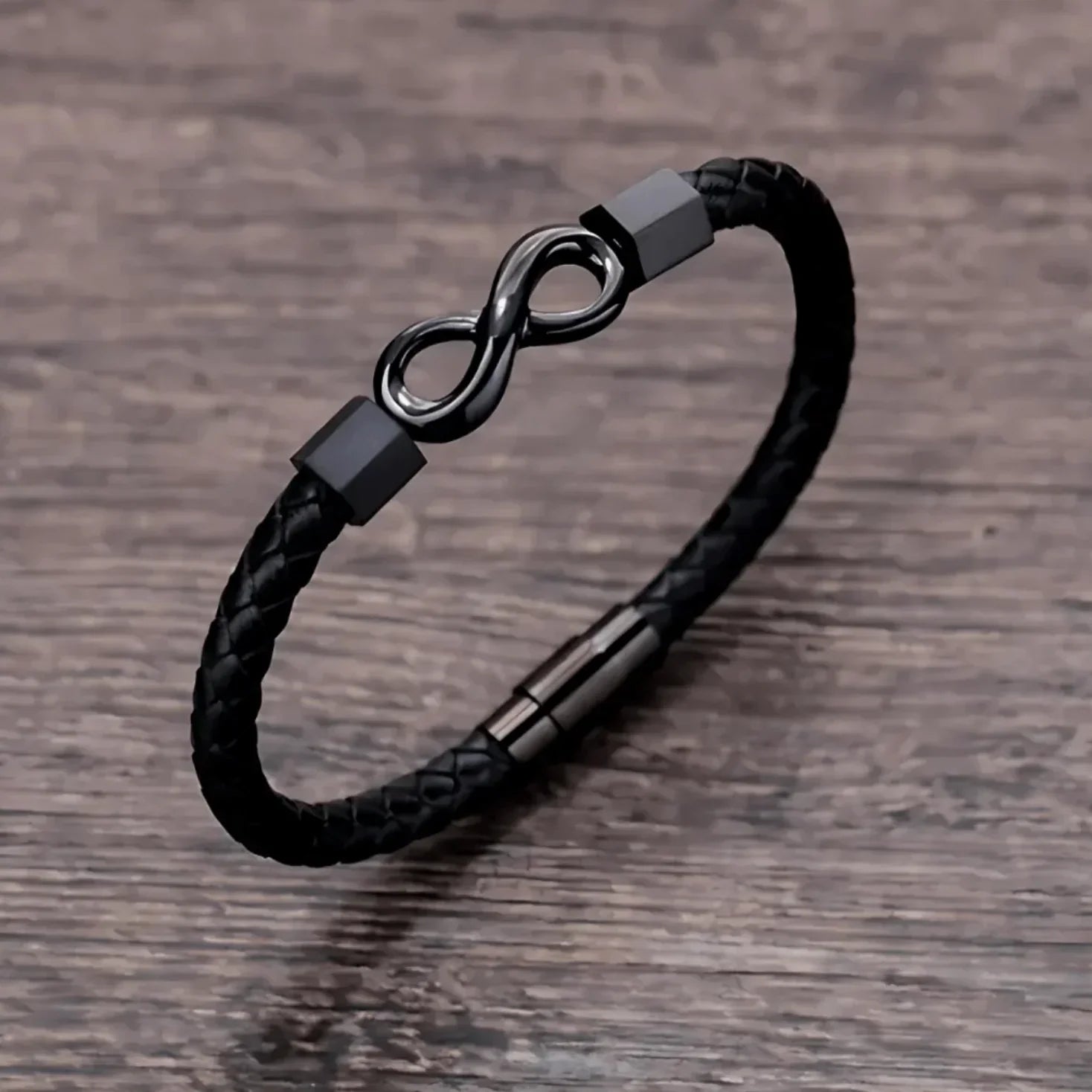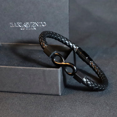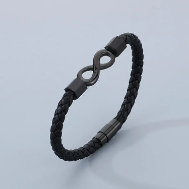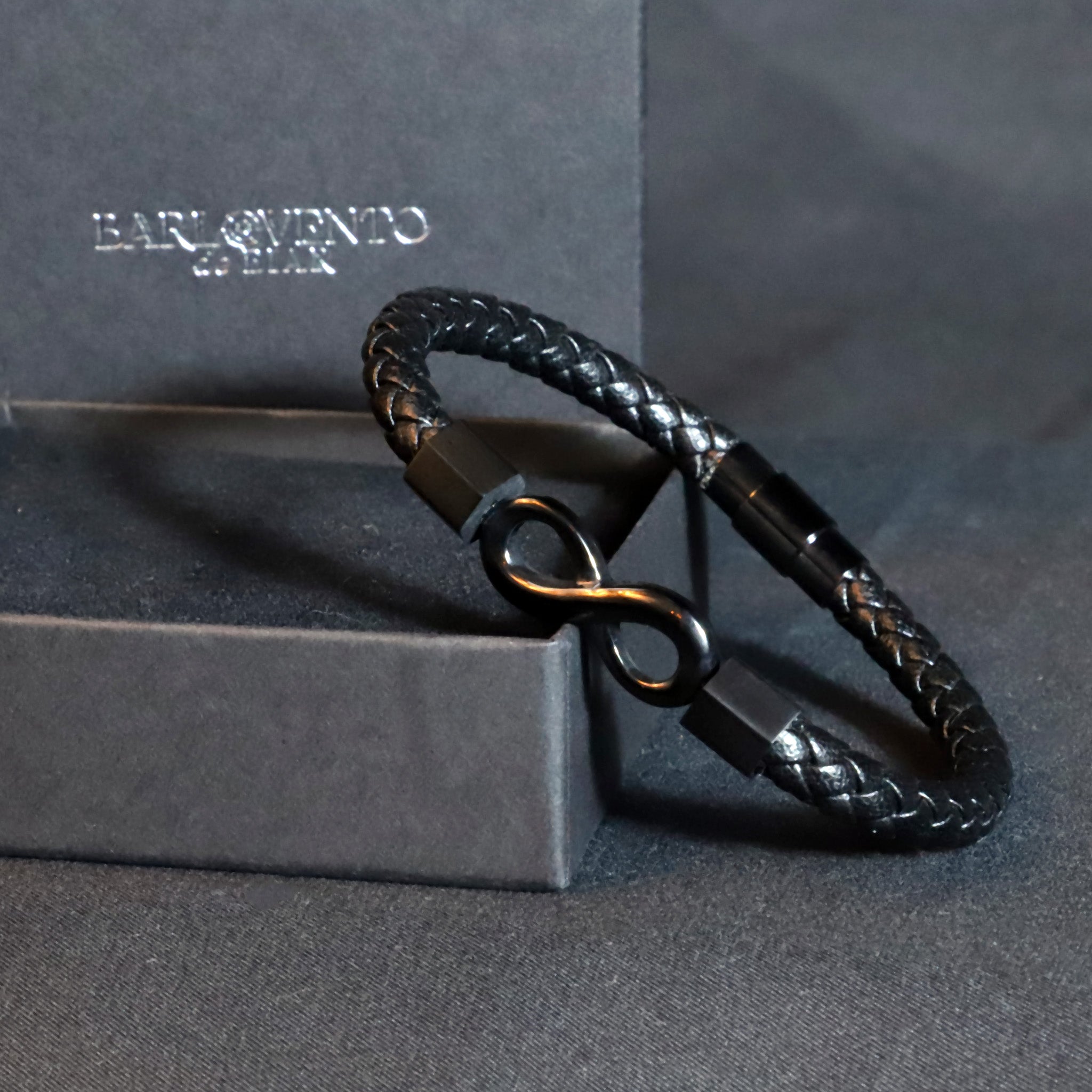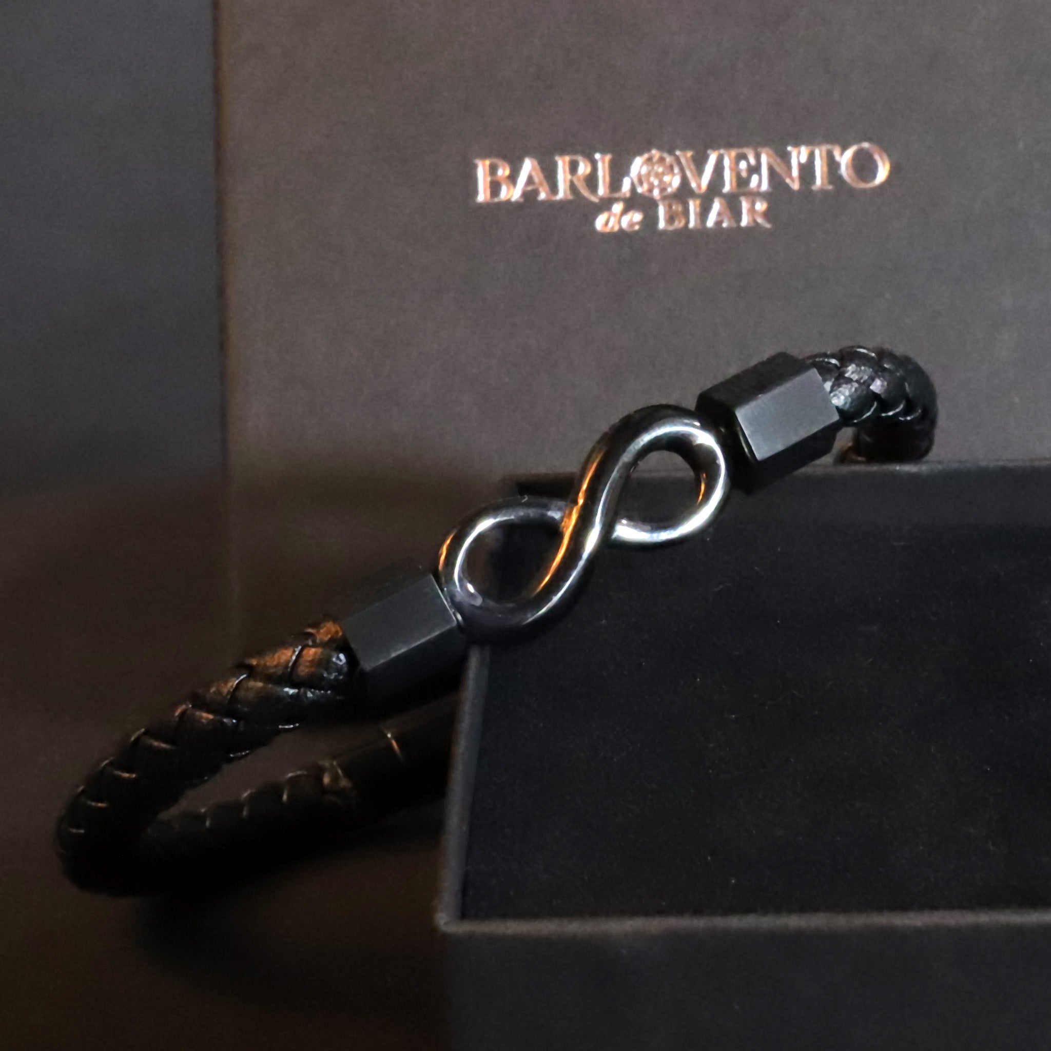 Esta pulsera impermeable está hecha de cuero vacuno auténtico y cuerda retorcida. Mide 200 mm de largo por 6 mm de ancho y presenta un diseño de infinito negro en acero inoxidable con baño de iones.