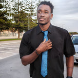 This blue tie measures 7.5 cm wide and features a leaf print. It comes with a matching 23 x 23 cm handkerchief, matching cufflinks, and a complimentary tie clip.