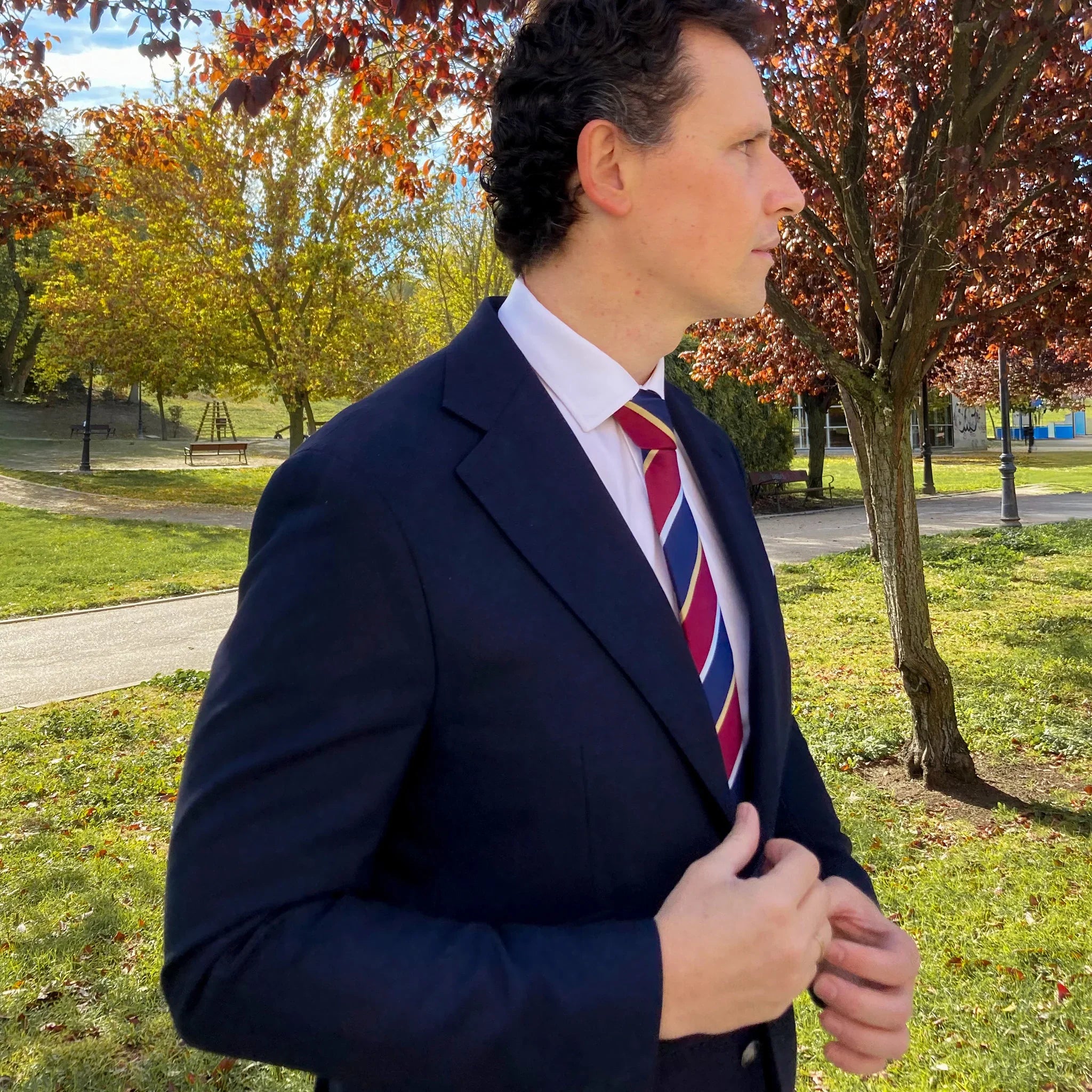 A bold and elegant tie, with thick blue and red stripes, accented with thin yellows and whites