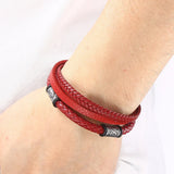 Red leather bracelet with stainless steel charms. Double-layer genuine cowhide leather, 205 mm inner bead, and 235 mm total length when unfolded. Features stainless steel accents and a magnetic clasp.