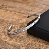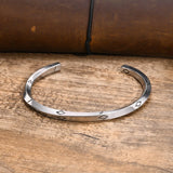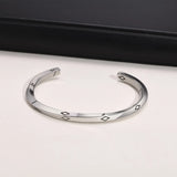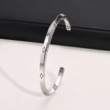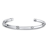Adjustable 304 stainless steel bangle bracelet with engraved black diamonds. The bracelet measures 4 mm wide and 64 mm thick at the inner center.