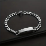 304 stainless steel chain bracelet with a solid rectangle measuring 4 x 0.8 mm wide. Silver-colored and adjustable from 20.5 to 25.5 cm.