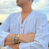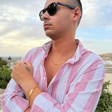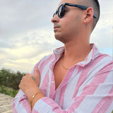 304 stainless steel chain bracelet, plated with 18k gold. Features a solid rectangle measuring 4 x 0.6 mm wide. Adjustable from 20.5 to 26.5 cm.