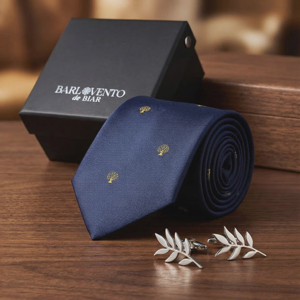 Un regalo ideal para los amantes de las aceitunas. El conjunto incluye una corbata azul con olivos bordados y un par de gemelos plateados con forma de hoja de olivo. Ambos se presentan en cajas de regalo.