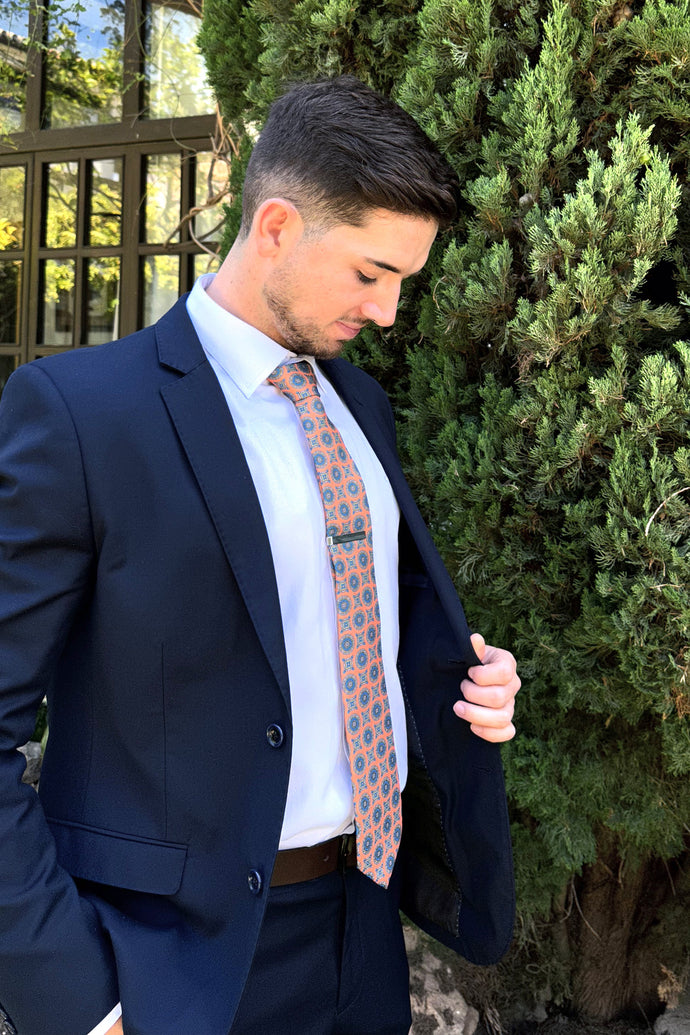 - Corbatas: La corbata es el espacio donde los caballeros pueden expresar su personalidad sin perder la tradición. Las corbatas de seda en colores cálidos como el burdeos, el dorado o el azul mediterráneo son opciones populares.Los estampados tradicionales pueden incluir lunares sutiles, pequeños estampados paisley o motivos regionales. La corbata debe anudarse con un estilo limpio y clásico, como el Windsor o el medio Windsor.