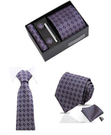Esta corbata morada de estilo italiano mide 7,5 cm de ancho y presenta un patrón geométrico clásico. Incluye un pañuelo de bolsillo a juego de 23 x 23 cm, gemelos a juego y un pasador de corbata de regalo.