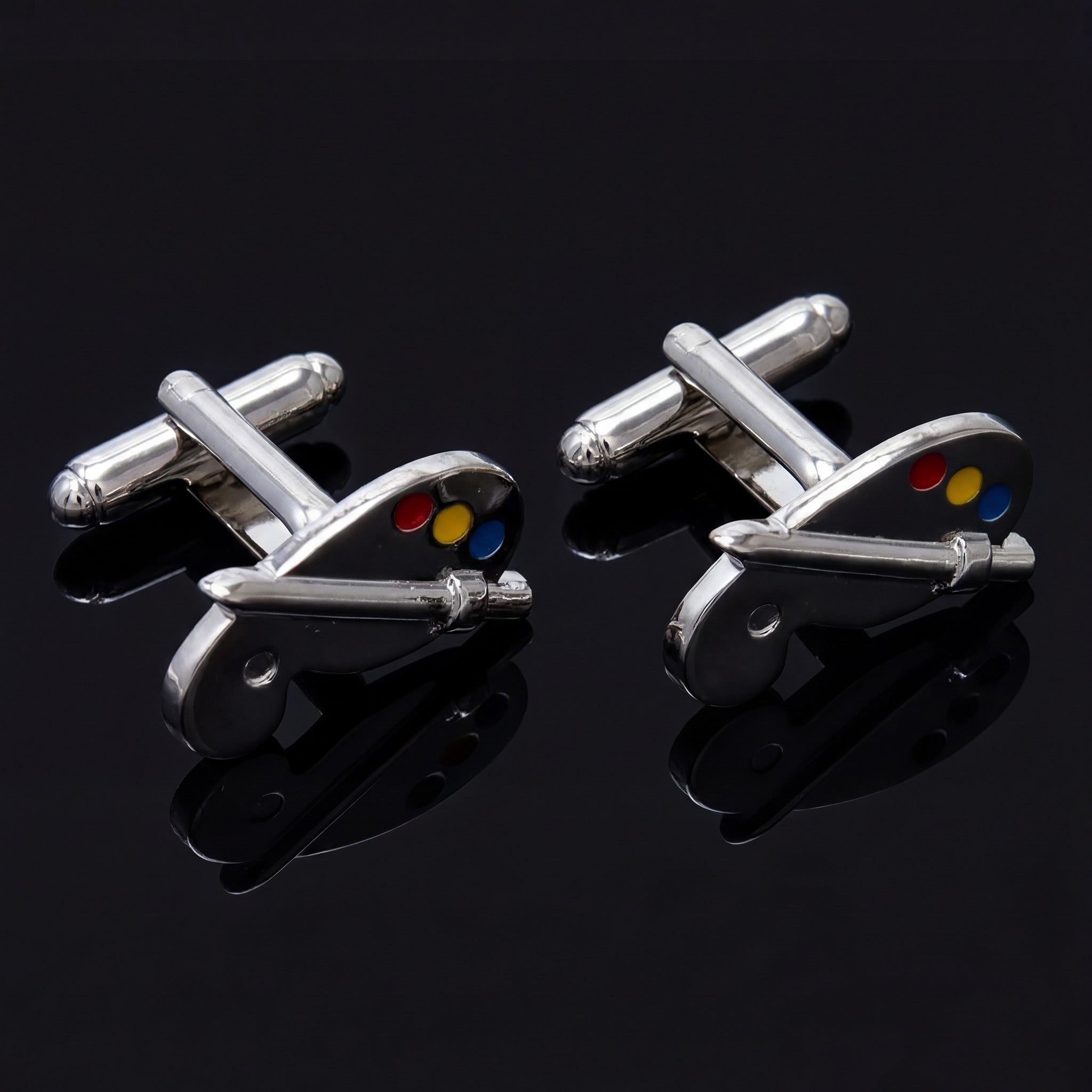 El arte en los puños: los gemelos Paleta de pintura son el tributo más elegante a la creatividad. Una paleta plateada con pequeños pinceles en cada gemelo, para el artista que también sabe vestirse o para el admirador del arte que quiere llevarlo consigo.