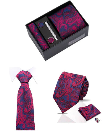 Perpignan · Conjunto de corbata con estampado paisley carmesí, pañuelo de bolsillo, gemelos y pasador de corbata