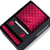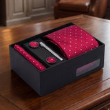 Piacenza · Corbata roja con lunares blancos con pañuelo de bolsillo, gemelos y pasador