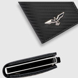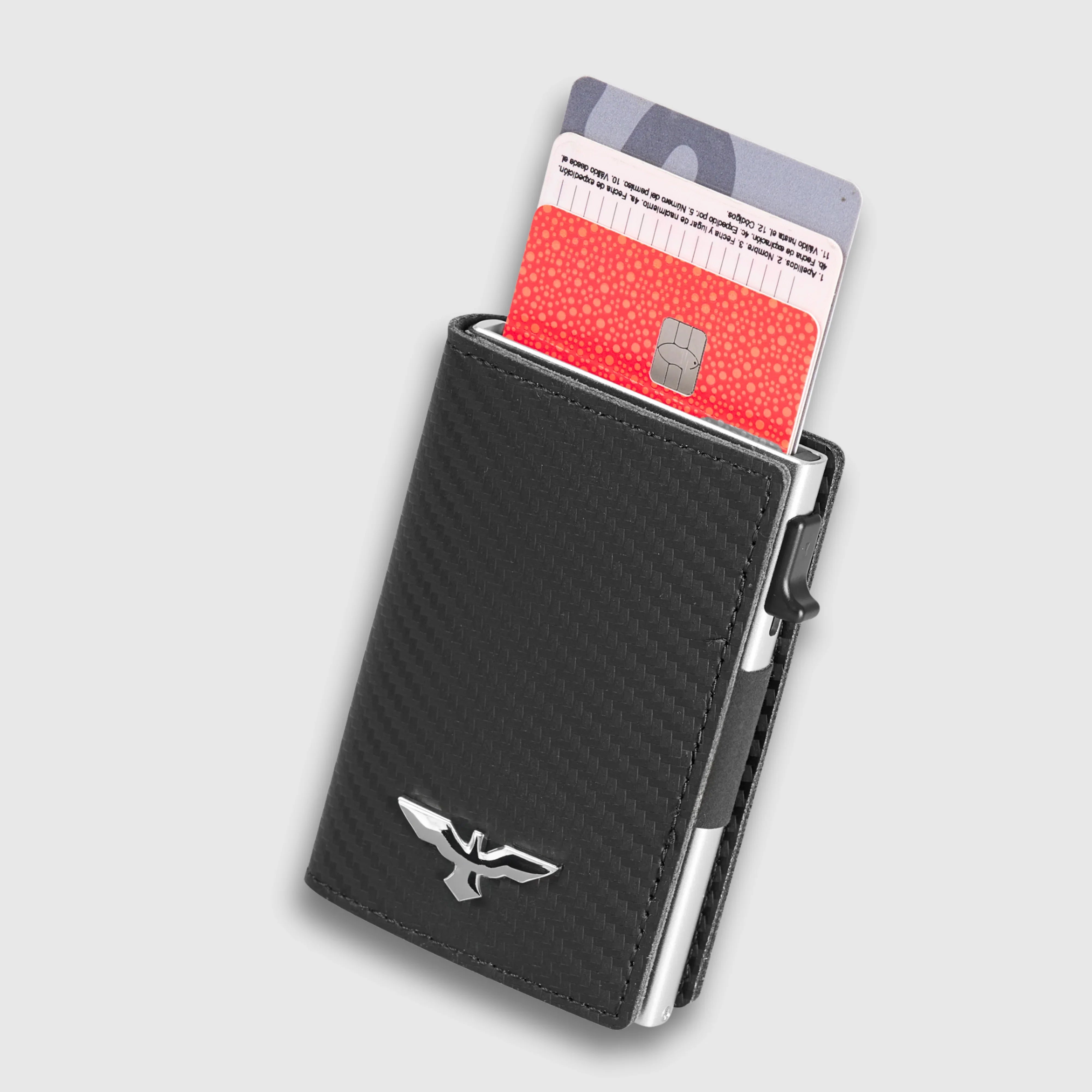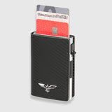 Fabricada con fibra de carbono de alta calidad y una caja interior de aluminio de grado aeroespacial, esta billetera es sinónimo de durabilidad, tecnología y estilo. Su práctico botón pop-up permite extraer las tarjetas de forma rápida y fluida, sin atascos. Además, el cierre magnético mantiene todo en su lugar con total seguridad.