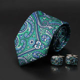 Este lindo conjunto de presente inclui uma gravata com estampa paisley azul e verde e abotoaduras de estilo semelhante. Ambos incluem caixas de presente.