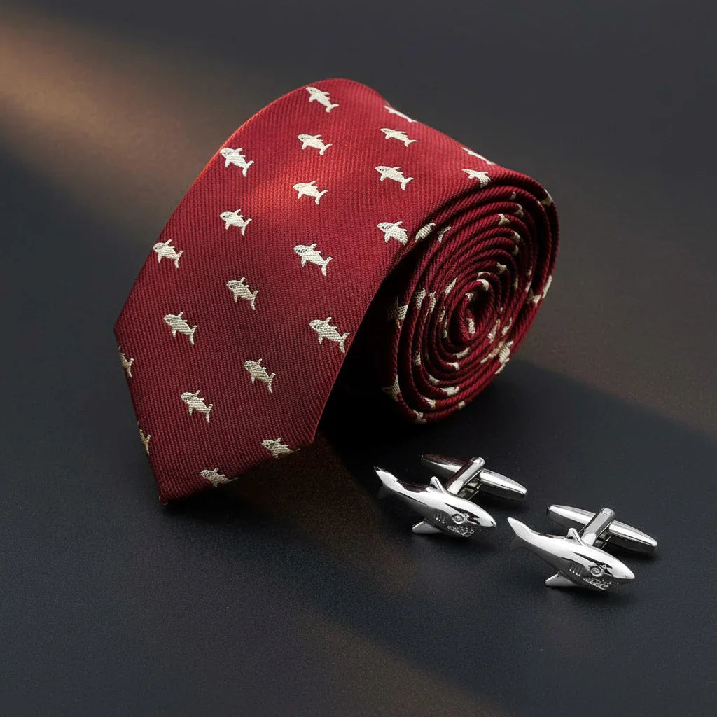 Para os amantes de tubarões e do oceano. Uma gravata vermelha escura bordada com pequenos tubarões e um conjunto de abotoaduras prateadas em formato de tubarão. Ambos em caixas de presente.