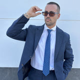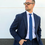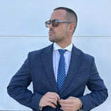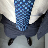 Gravata de seda azul estilo italiano com estampado geométrico em vários tons de azul. A lâmina de 7,5 cm equilibra modernidade e distinção.