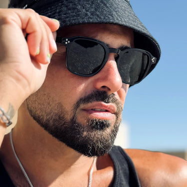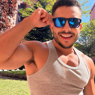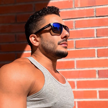 Os clássicos óculos de sol pretos têm detalhes azuis e lentes refletivas azuis. Lentes polarizadas UV400 bloqueiam 100% dos raios UVA e UVB nocivos. Estrutura de policarbonato leve e premium.