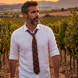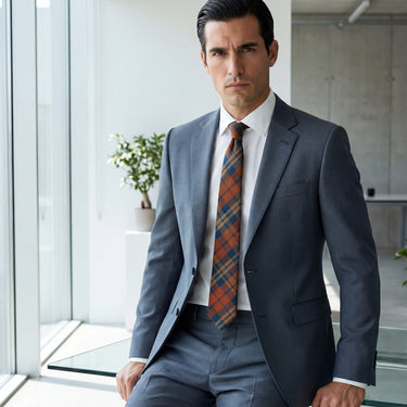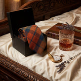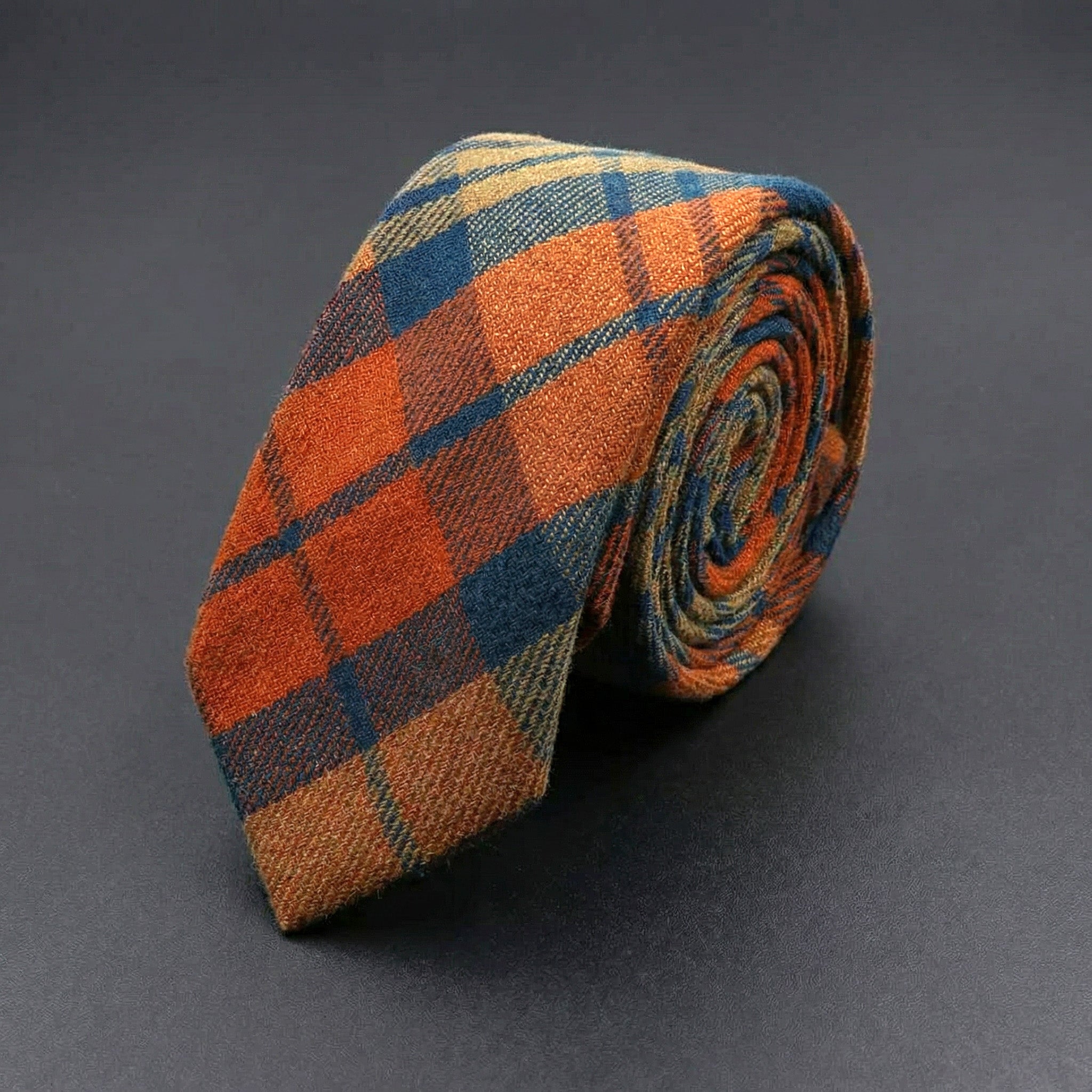La corbata Balmoral es una declaración de estilo para el hombre que sabe que los detalles marcan la diferencia. Confeccionada en 100% lana, presenta un llamativo estampado de cuadros en tonos naranja quemado, azul petróleo y ocre que evoca los paisajes otoñales de las Highlands escocesas.