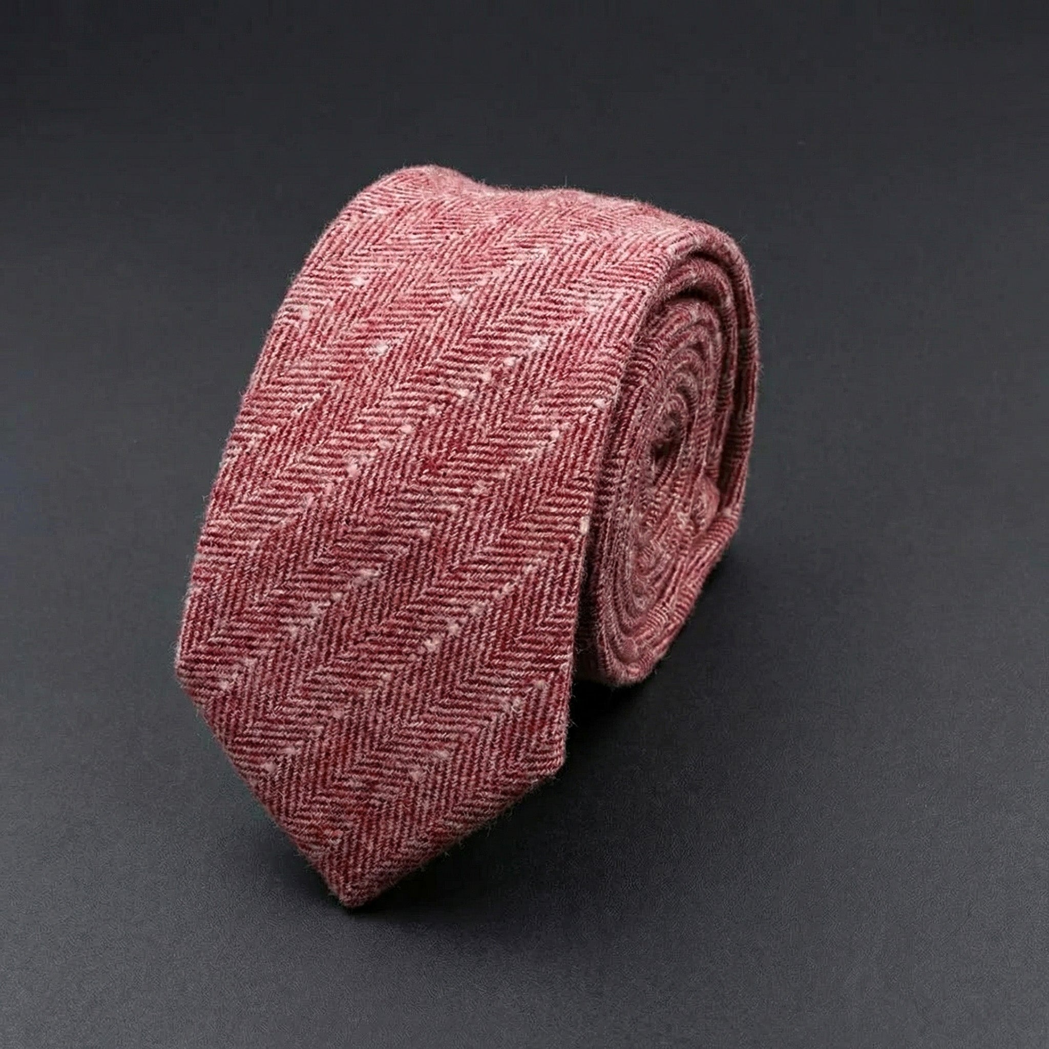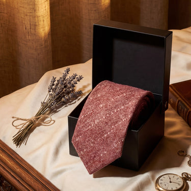 Su tono rosado terroso transmite confianza y buen gusto, alejándose de los colores convencionales sin caer en lo estridente. Las sutiles imperfecciones del tejido son parte de su encanto: cada corbata tiene un carácter propio que la diferencia de cualquier accesorio genérico.