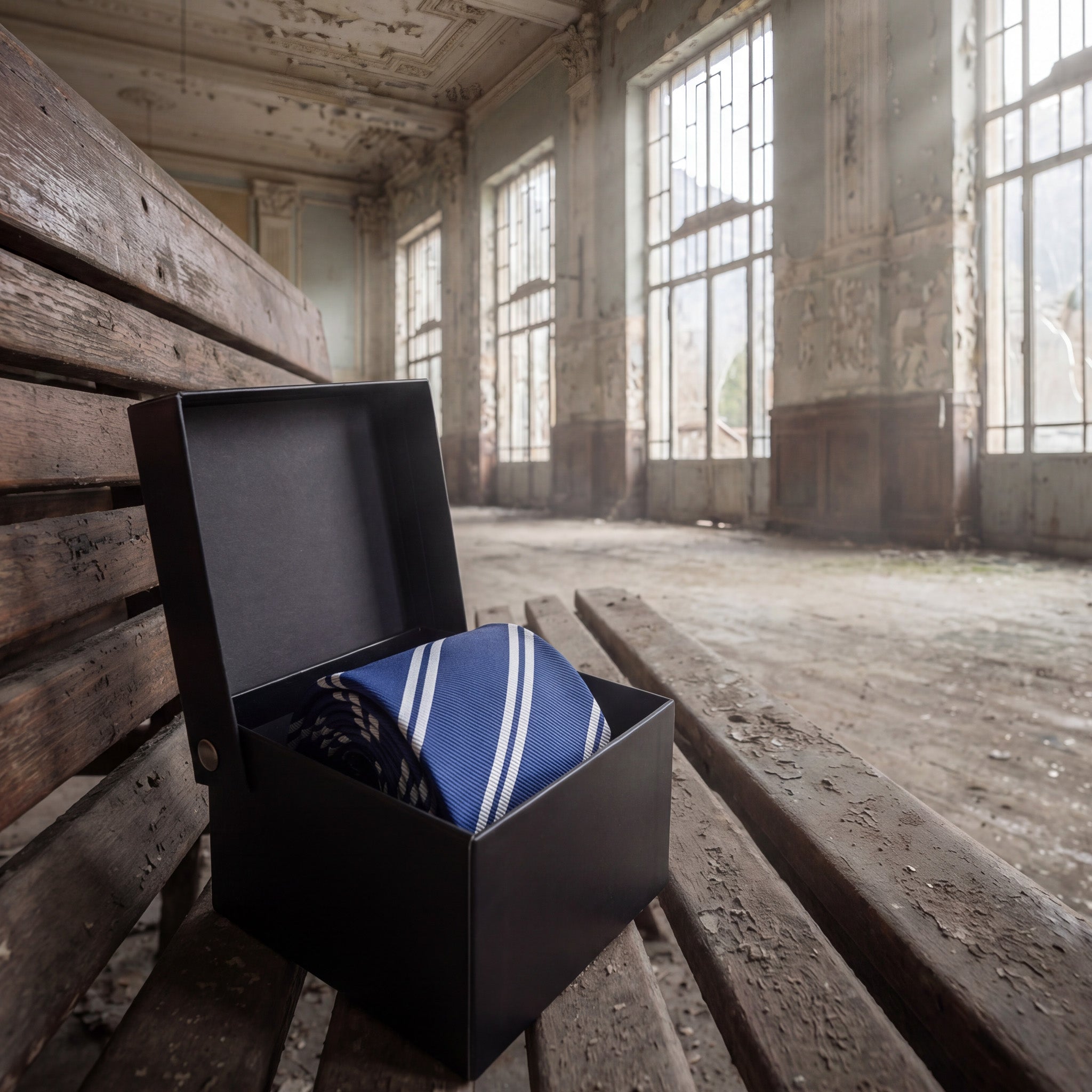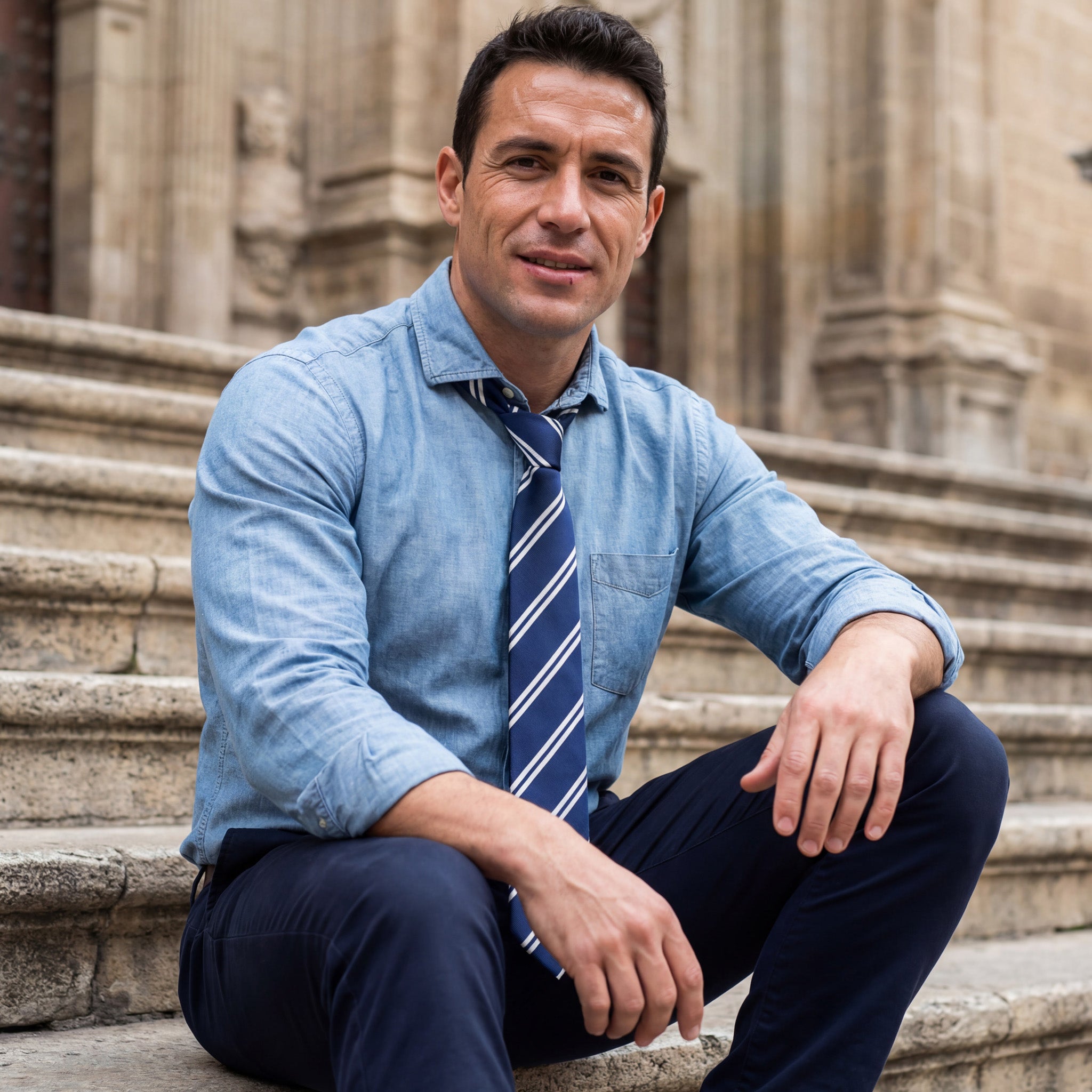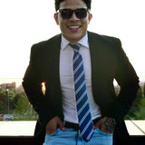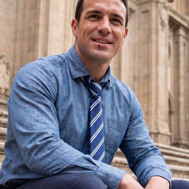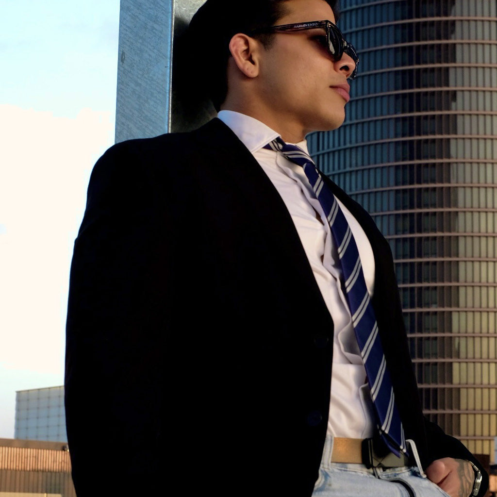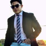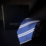 Uma gravata azul clássica com sutis listras brancas ficará atraente em qualquer reunião de negócios ou evento esportivo.