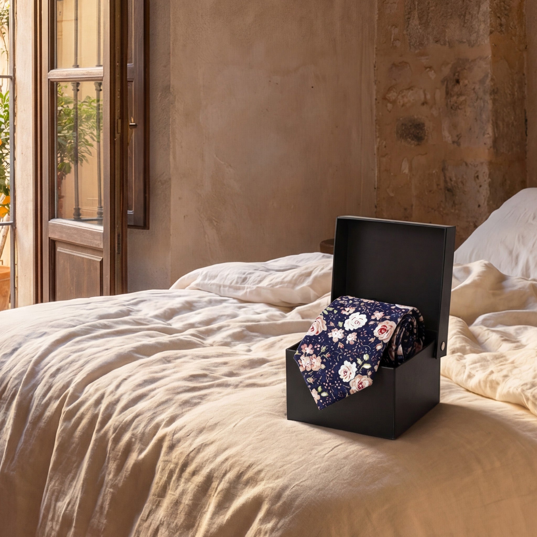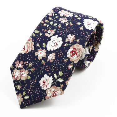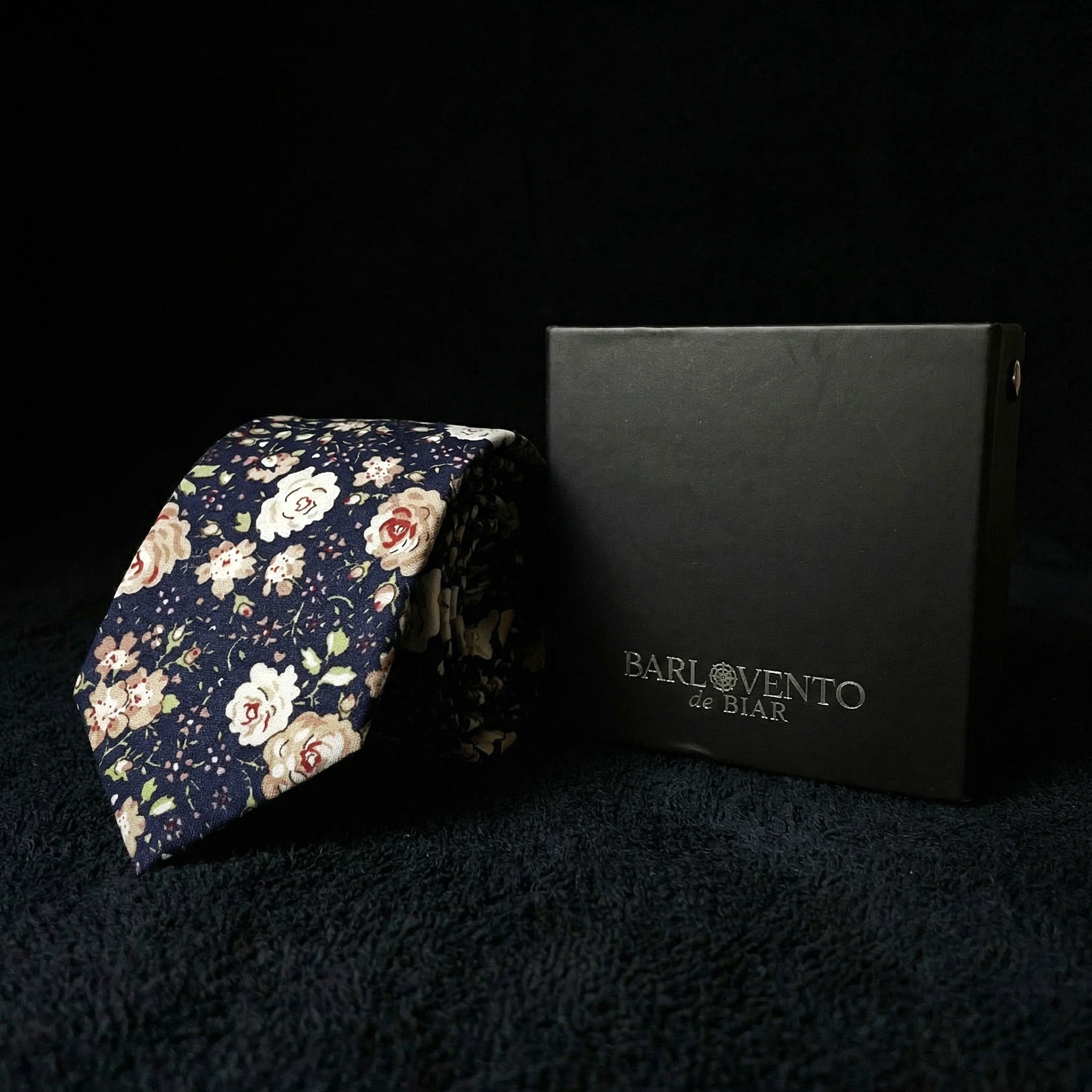 La corbata Rosaleda es una declaración de romanticismo masculino. Confeccionada en 100% algodón, presenta un exuberante estampado de rosas en tonos crema, rosa empolvado y granate sobre un fondo azul marino profundo, con delicados detalles de hojas verdes que completan un jardín en miniatura alrededor de tu cuello.