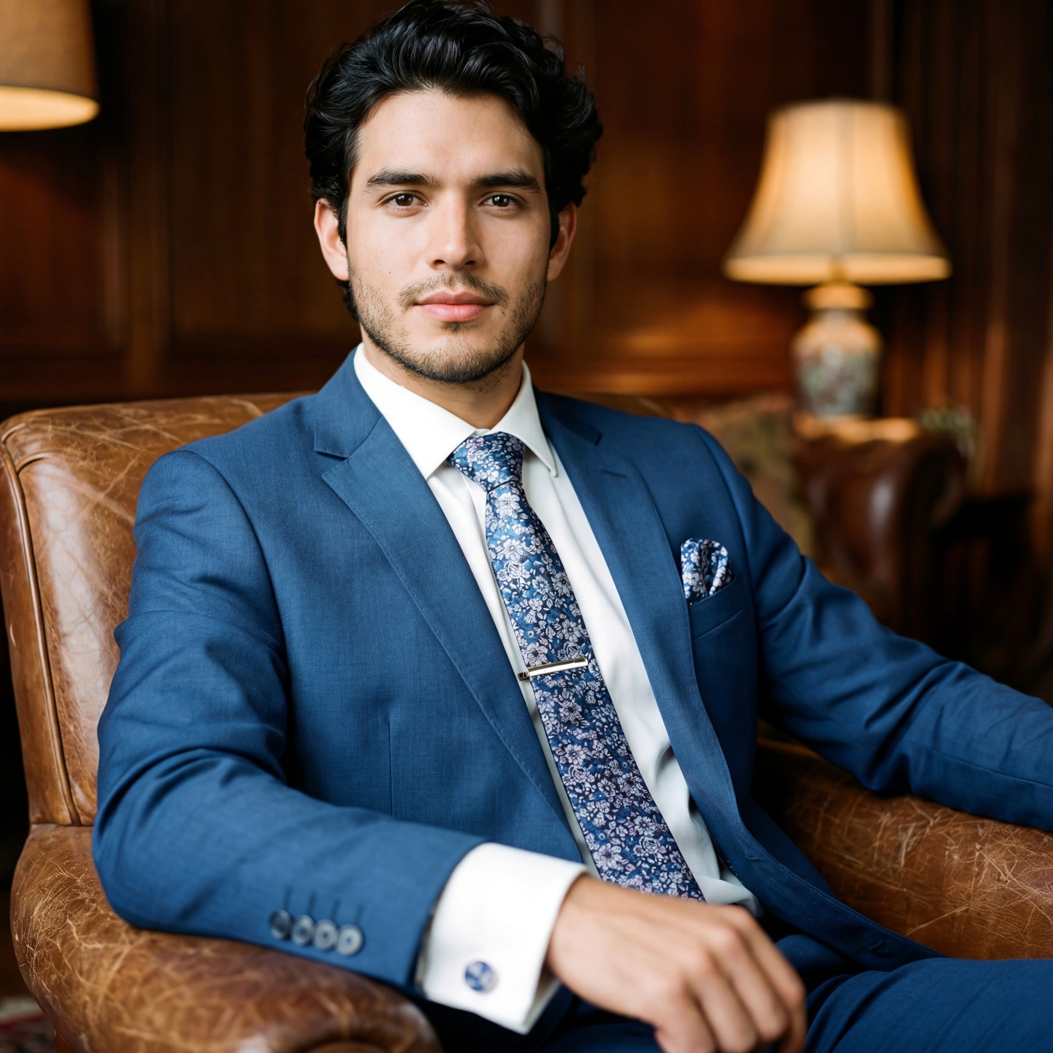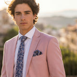 Salvias · Conjunto de gravata floral azul e rosa com lenço, botões de punho e presilha
