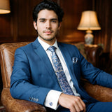 Esta gravata azul e rosa mede 7,5 cm de largura e apresenta um bonito estampado floral. Acompanha um lenço de 23 x 23 cm, botões de punho a condizer e um prendedor de gravata de cortesia.