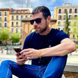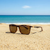 Estes elegantes óculos de sol apresentam uma armação frontal em formato de tartaruga, feita de termoplástico TR90, forte e leve. Lentes polarizadas UV400 marrons bloqueiam 100% dos raios UVA e UVB. Elegantes hastes douradas e um sutil logotipo Barlovento gravado em um fundo de fibra de carbono.